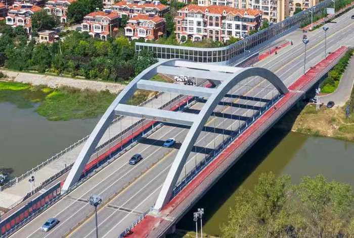 愚公橋位于滕州市荊泉路(主干道)跨越荊河河道處,橋梁全長146米,寬36米,100米主橋采用下承式鋼箱拱,兩端20m引橋為先張法預(yù)應(yīng)力簡支板梁橋。此橋是滕州市第一座大跨度鋼結(jié)構(gòu)橋梁,同時,我們充分保留了老愚公橋的原始風(fēng)貌,并對其進行了加固和重新修繕,形成特有的滕州記憶和城市景觀,已成為滕州市的新亮點、新景觀。此橋由滕州市信華集團權(quán)屬企業(yè)滕州市房地產(chǎn)綜合開發(fā)有限公司投資建設(shè),總造價7000余萬元,此橋于2018年5月開工,并于2019年10月1日順利竣工通車。