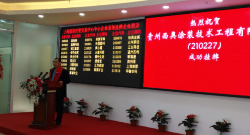 2016年11月28日,是西奧人值得永遠(yuǎn)銘記的日子。貴州西奧涂裝技術(shù)工程有限公司順利通過(guò)審核批復(fù),正式在上海股權(quán)托管交易中心掛牌上市(簡(jiǎn)稱(chēng):西奧涂裝,股權(quán)代碼:210227)。公司董事長(zhǎng)楊景龍先生、上海澤淘投資管理有限公司總經(jīng)理梁苡平及西奧管理代表出席了本次掛牌儀式。此次掛牌標(biāo)志著貴州西奧涂裝技術(shù)工程有限公司從此登陸了資本市場(chǎng),這對(duì)西奧涂裝的發(fā)展,具有重大而深遠(yuǎn)的意義。