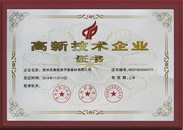 2月27日,貴州省科技廳、省財政廳、省稅務(wù)局聯(lián)合向貴州西奧輕質(zhì)節(jié)能板材有限公司批準(zhǔn)“國家高新技術(shù)企業(yè)”證書(編號GR201852000373)。這有效地提升了貴州西奧品牌形象,促進企業(yè)持續(xù)進行研究開發(fā)與技術(shù)成果轉(zhuǎn)化,標(biāo)志著貴州西奧正式邁入國家高新技術(shù)企業(yè)行列。